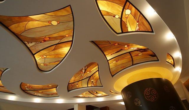 Оформление может быть разным. Конструкцию, дизайн, отделку внешней поверхности потолка – все это можно менять по своему усмотрению. Но, чтобы было от чего оттолкнуться для создания своего собственного шедевра, ниже приведено несколько фото примеров того, как могут быть оформлены потолки из гипсокартона, придуманные и спроектированные специально для спальни.